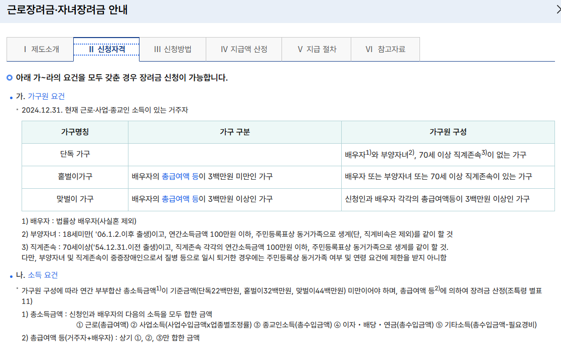 - 근로장려금: 근로·사업·종교인 소득이 있는 저소득 가구 대상