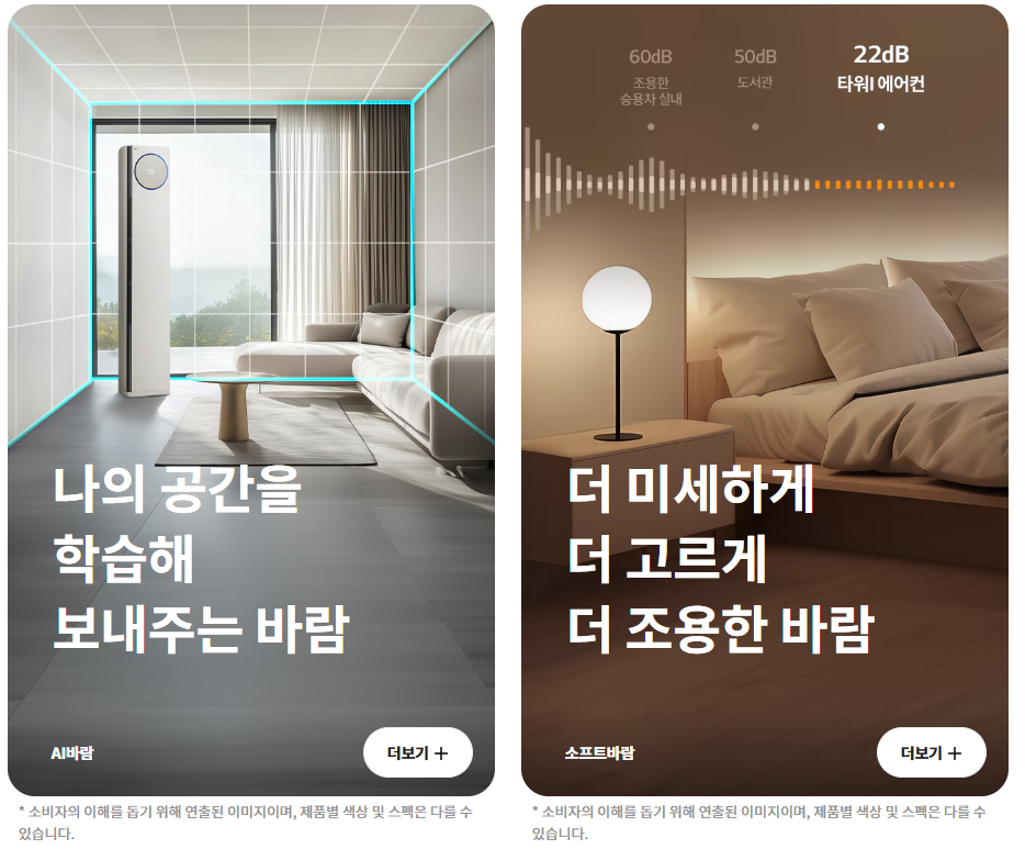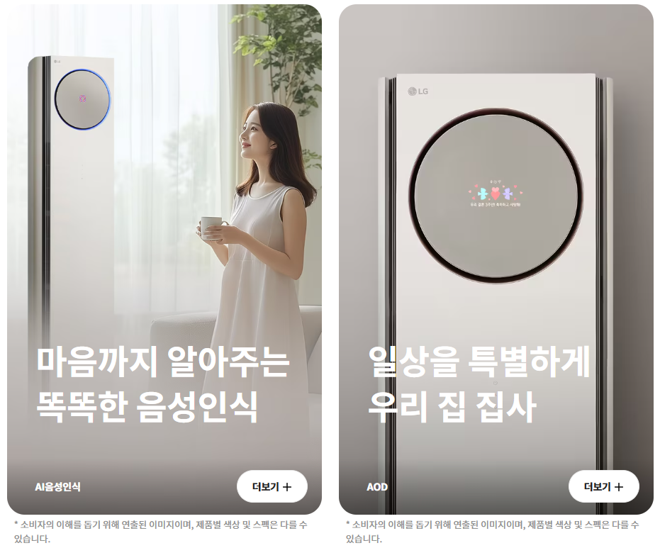 - 휘센 쿨: AI 바람 기능과 AI 건조 기능을 통해 쾌적한 실내 환경을 유지합니다. LG 씽큐 앱과 연동하여 전력 사용량을 설정하고, 목표 초과 시 알람을 보내 에너지 절약을 돕습니다.(헬로티)