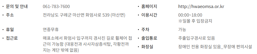 - 구례터미널에서 화엄사행 버스(약 20분 소요) 이용 또는 택시 이용 (약 15분)